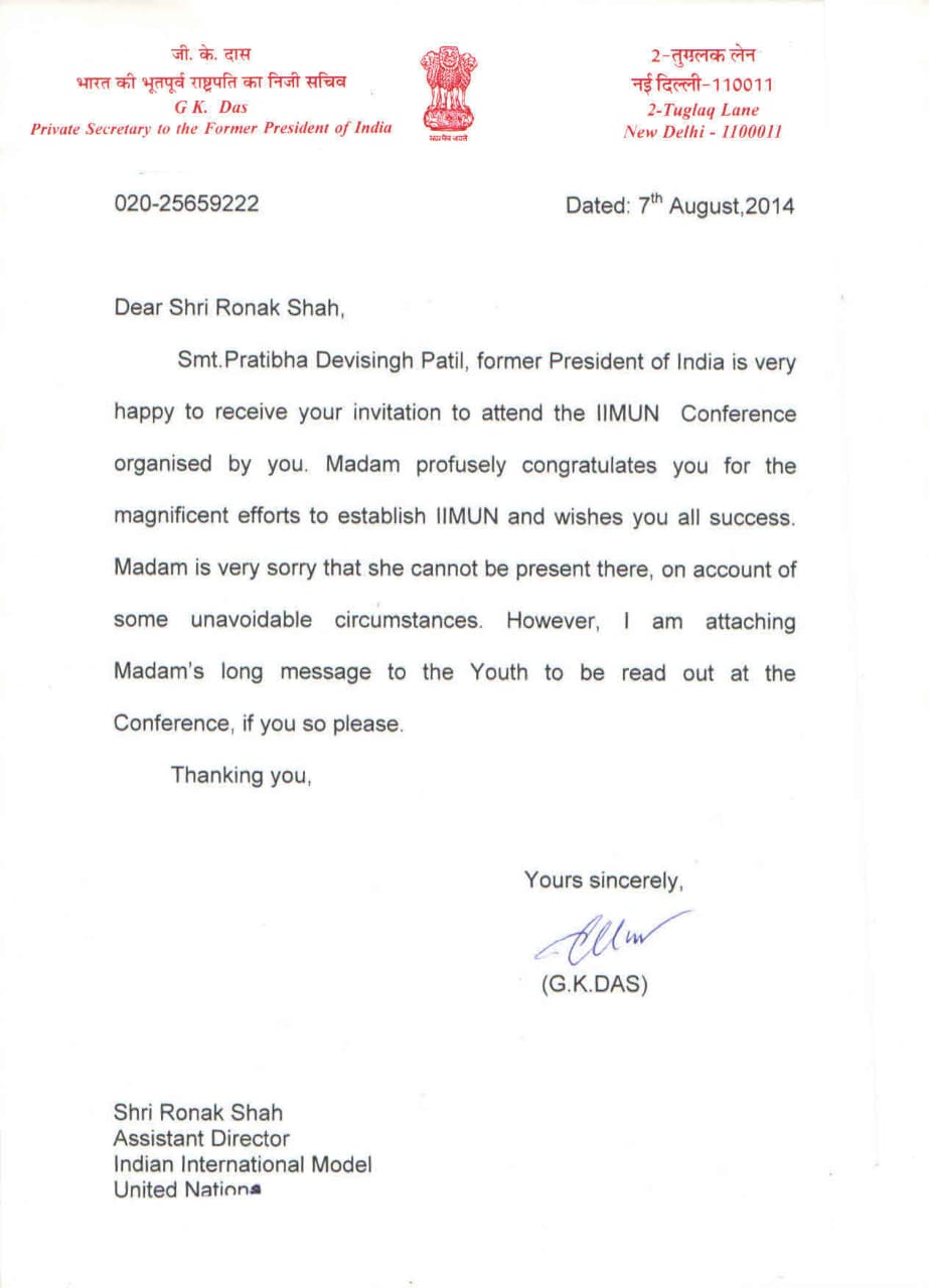 Letter from Former President of India, Smt. Pratibha Devsingh Patil to I.I.M.U.N with a long message for the delegates