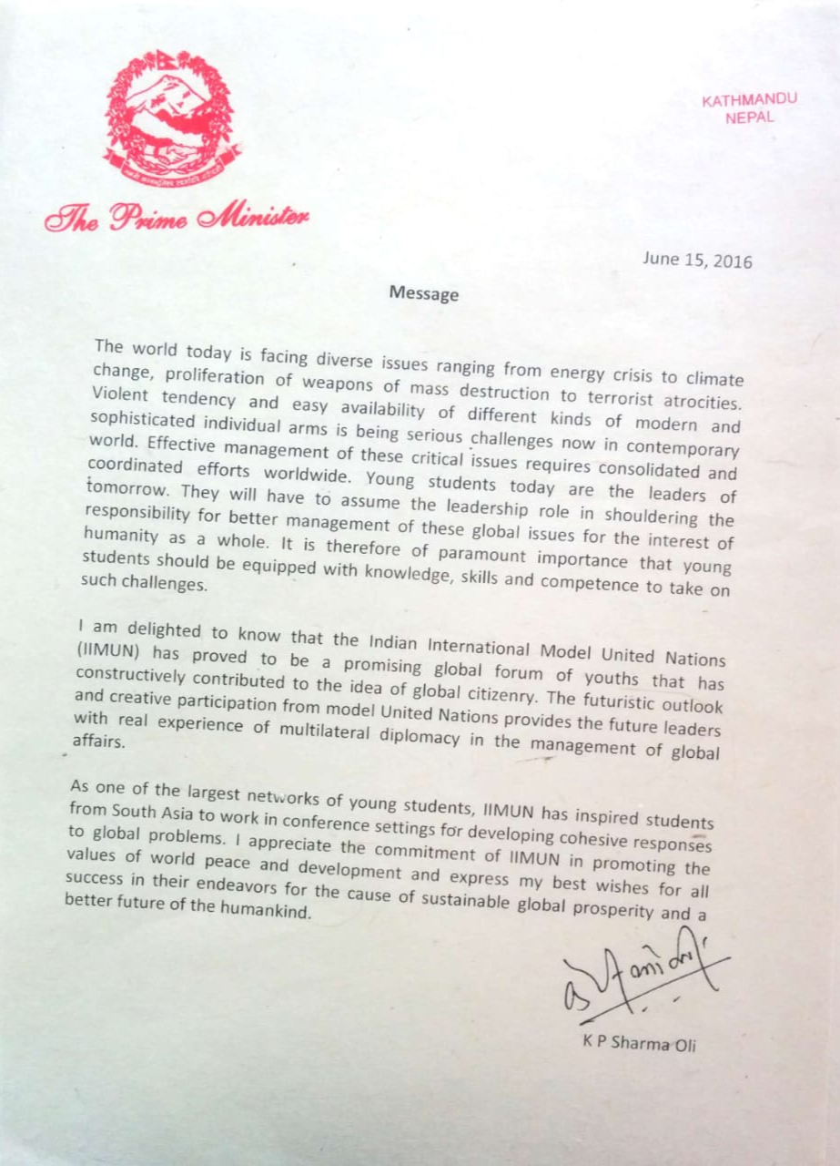 Letter from Prime Minister of Nepal, KP Sharma Oli talking about importance of multilateral diplomacy and global citizenship