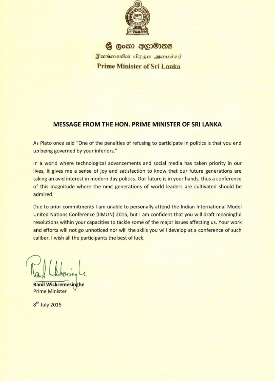 Letter from Prime Minister of Sri Lanka, Ranil Wickremensinghe emphasisng the role of I.I.M.U.N. in global citizenship