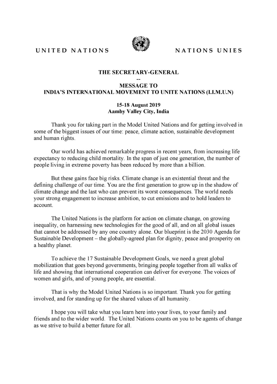 Letter from the Secretary-General of United Nations to I.I.M.U.N. talking about MUN's and importance of the Youth
