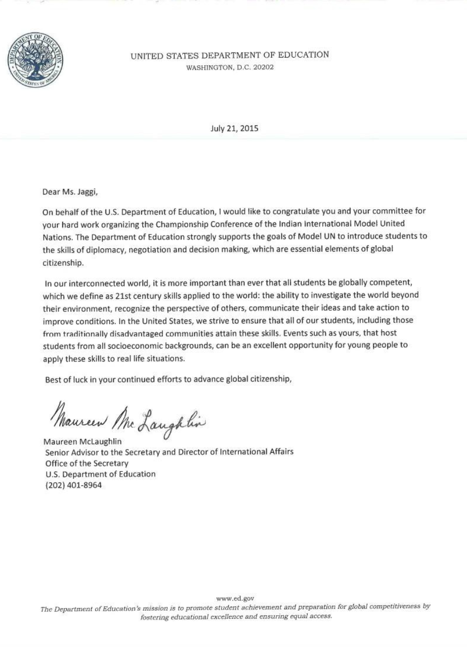 Letter from United States Department of Education to I.I.M.U.N. talking about importance of such simulations and global citizenship